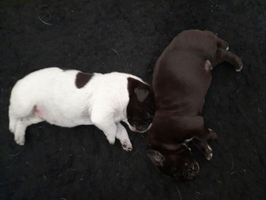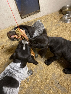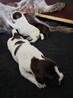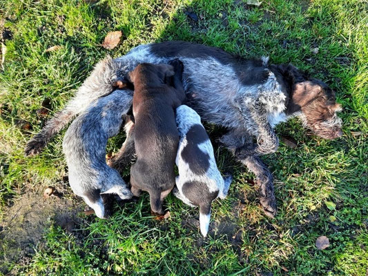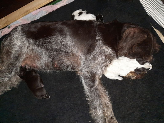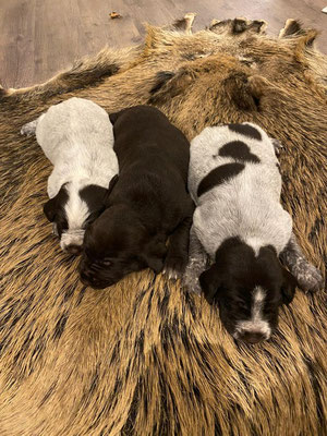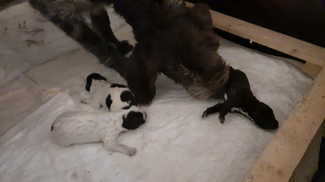 Am 01.11.2020 war es dann so weit und der E-Wurf fiel. Der Wurf startete gut und Amsel kam mit der neuen Situation ihrer ersten Geburt zurecht. Jedoch behielt dieses Jahr seine Meinung zu unserem Hundenachwuchs bei. Die Geburt blieb nicht komplikationslos. Am Ende sind es zwei Rüden und eine Hündin, welche uns die Vorweihnachtszeit verschönern werden.