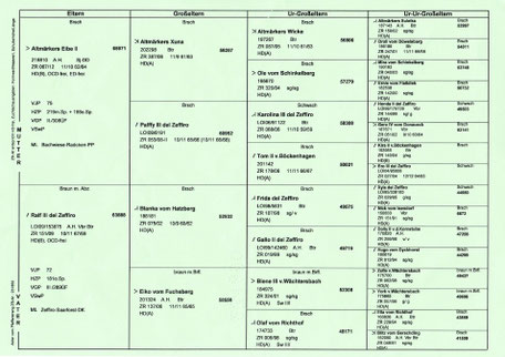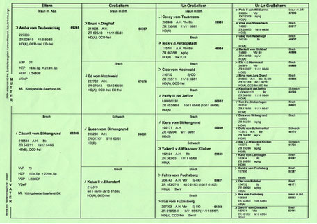 Name des Hundes | ZB-Nr. | Spur | Nase | Suche | Vorstehen | Führigkeit | Gesamt | Laut | Sonstiges |